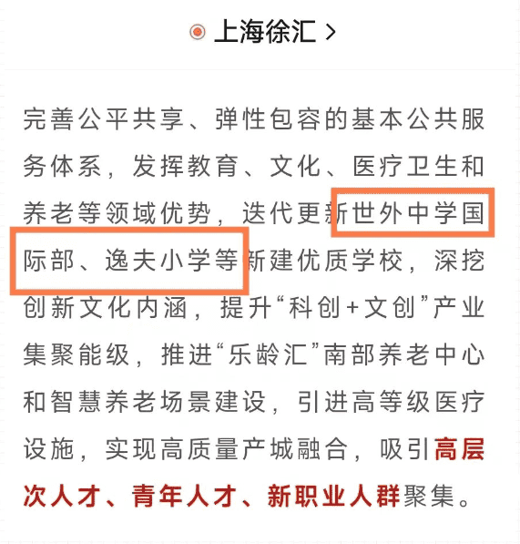 近日,上海徐匯官方在一篇關于徐匯華涇鎮建設的文章中提到,將會“迭代更新世外中學國際部、逸夫小學等新建優質學校”。