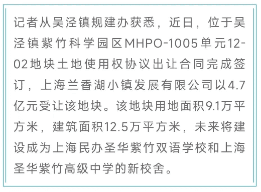 根據閔行區相關部門官方消息,吳涇鎮紫竹科技園區某地塊將建設上海民辦圣華紫竹雙語學校和上海圣華紫竹高級中學的新校舍,該地塊用地面積9.1萬平方米,建筑面積12.5萬平方米。