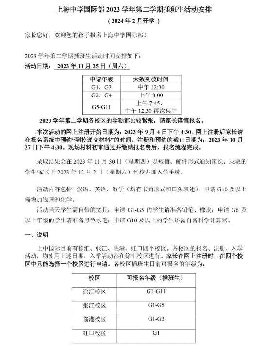 近日,上中國際官宣了第二學期插班生活動,申請年級涵蓋G1-G11。