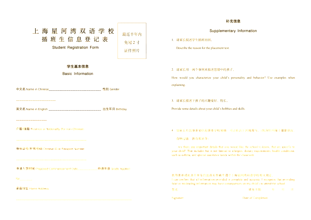 1.請用中文完整填寫兩頁插班信息登記表,需附一寸照片一張,二寸照片一張,照片背面請寫上學生中文姓名